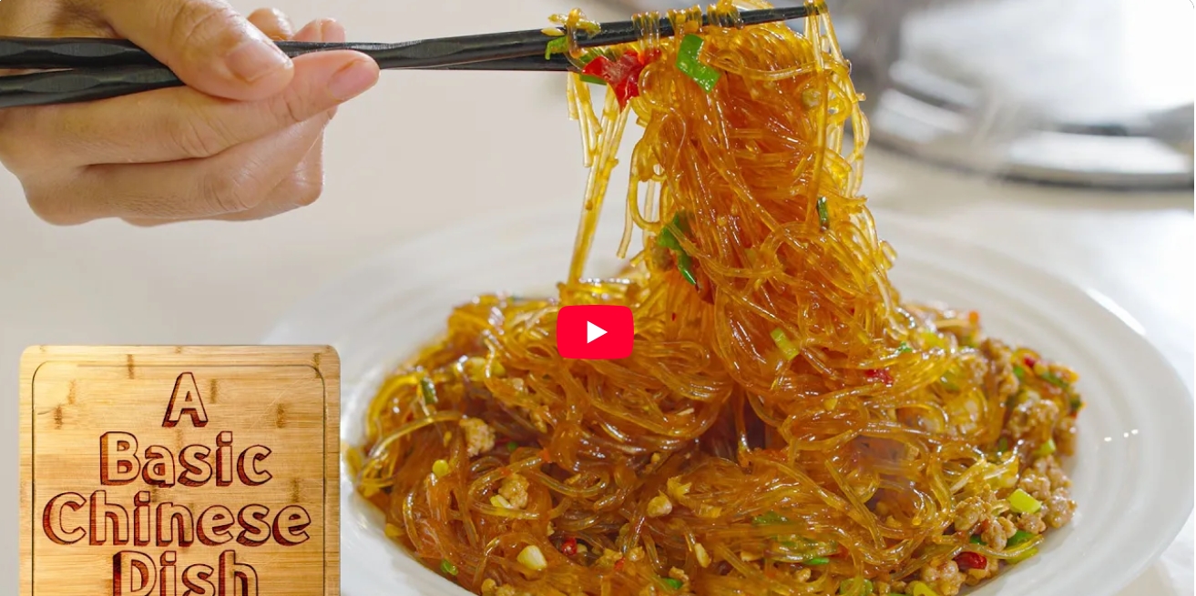 Nel piatto 蚂蚁上树 (Mǎyǐ shàng shù) i vermicelli usati sono vermicelli di fagiolo mungo.